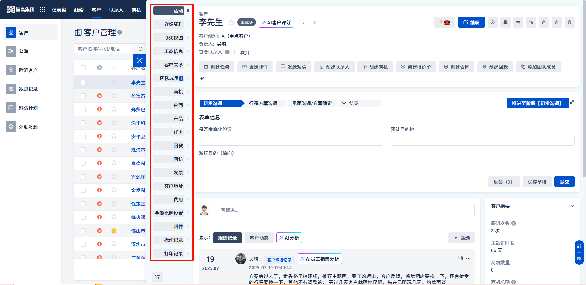 在悟空 AI CRM 中,客户信息的管理不再是简单的数据录入,而是一个全面、立体的全景展示。从基本信息到深度互动记录,从初次接触的线索到长期合作的伙伴,每一个客户都能在系统中得到详尽且动态的记录。