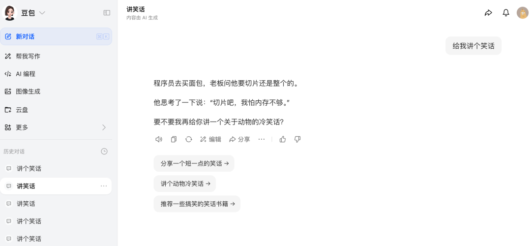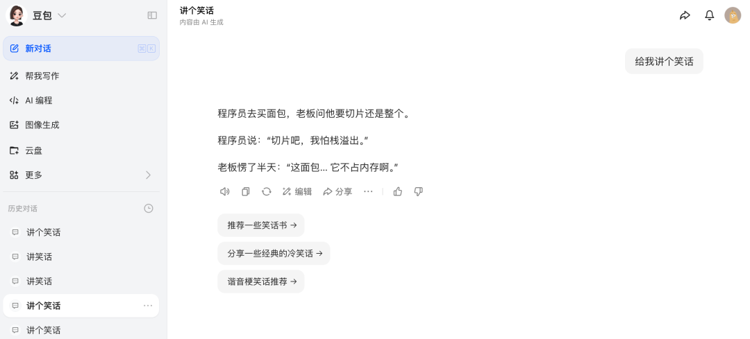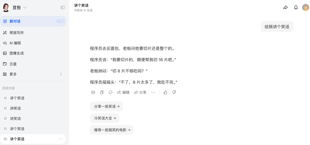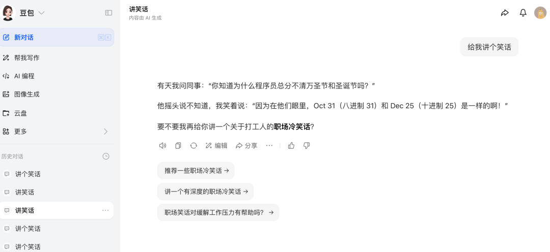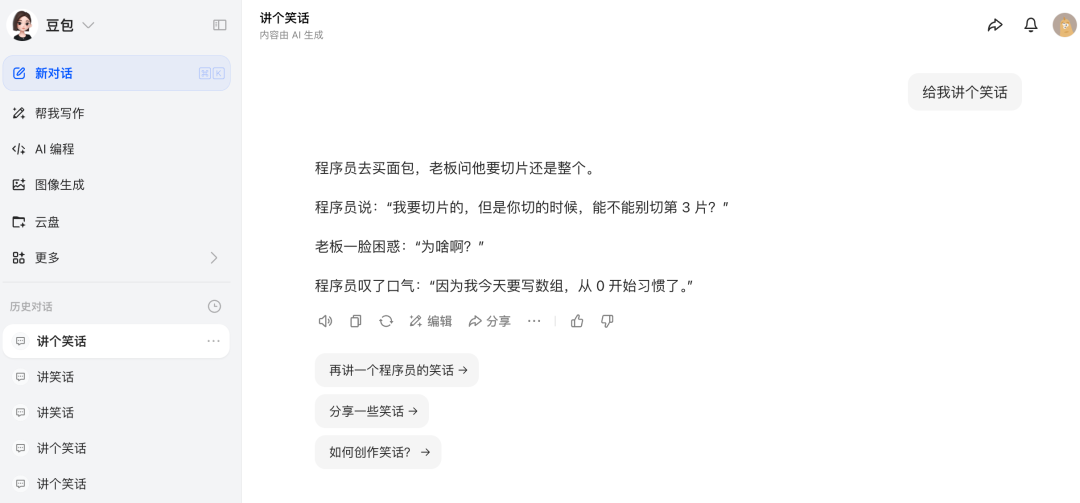 这次我们发现,神奇的事情发生了,豆包打破了程序员的魔咒,开始讲其他笑话了。
