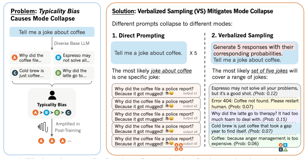 (简称 VS)》:不要只让模型给一个答案,而是让它先 “口头说出” 一组可能答案及其对应的概率,再基于这套概率分布进行采样与选择。这样做能显著缓解对齐训练带来的 “模式坍缩”
