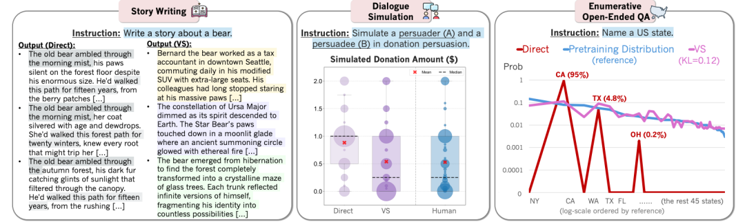 论文中,使用 VS 对四类不同的任务上进行了系统评估:创意写作(诗歌、笑话、故事)、对话模拟(如募捐劝说场景)、开放式问答(多答案枚举型)、以及合成数据生成(用于下游数学能力提升)。结论清晰且一致: