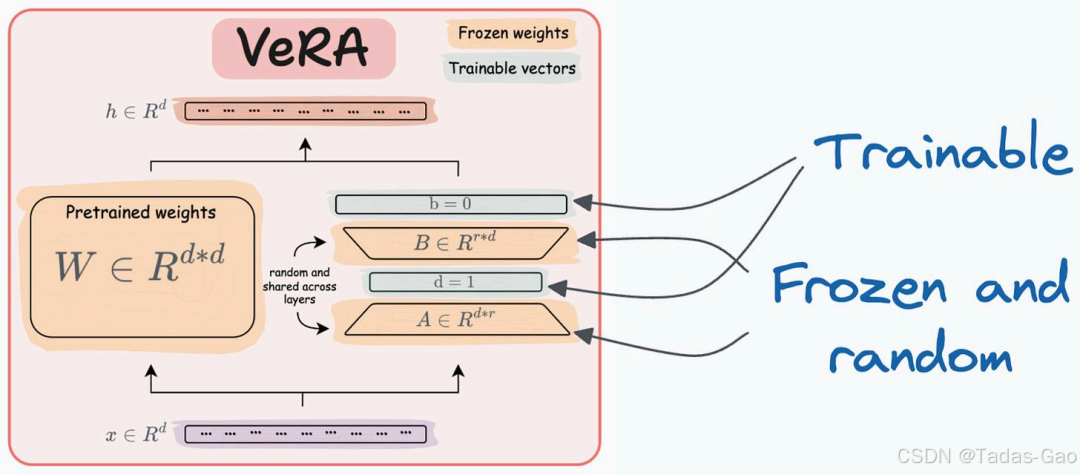在 LoRA 中,每一层都有一对不同的低秩矩阵A和B,且这两个矩阵都参与训练。然而在VeRA中,VeRA 采用共享随机矩阵 A 和 B,并引入可训练的缩放向量 d 和 b,使可训练参数比 LoRA 减少 10 倍以上,适用于低资源场景。VeRA的核心思想是学习微小的、特定于各层的缩放向量(记为b和d),这些向量是唯一可训练的参数。