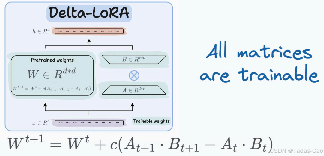 除了训练低秩矩阵外,矩阵W也会被调整,但并非采用传统方式。而是将连续两个训练步骤中低秩矩阵A与B乘积的差值(或增量)叠加到W上,从而增强表达能力,同时不增加额外计算成本: