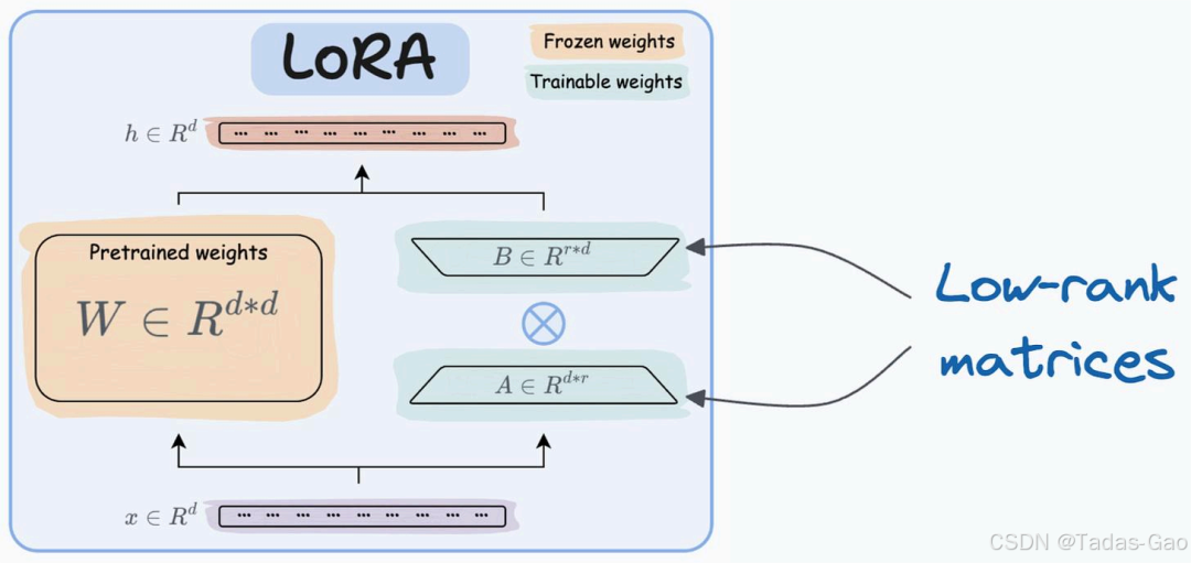 将两个低秩矩阵A和B与权重矩阵叠加,这些权重矩阵包含可训练参数。不对W进行微调,而是调整这些低秩矩阵中的权重。