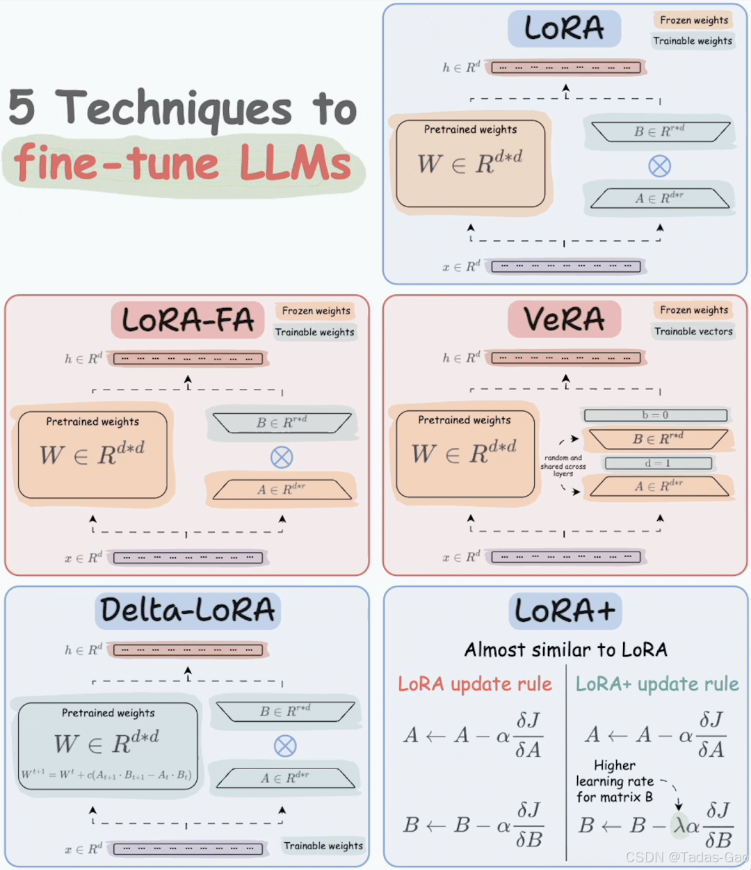 但如今,我们拥有多种优化大语言模型的微调方法,下图展示了五种主流技术: