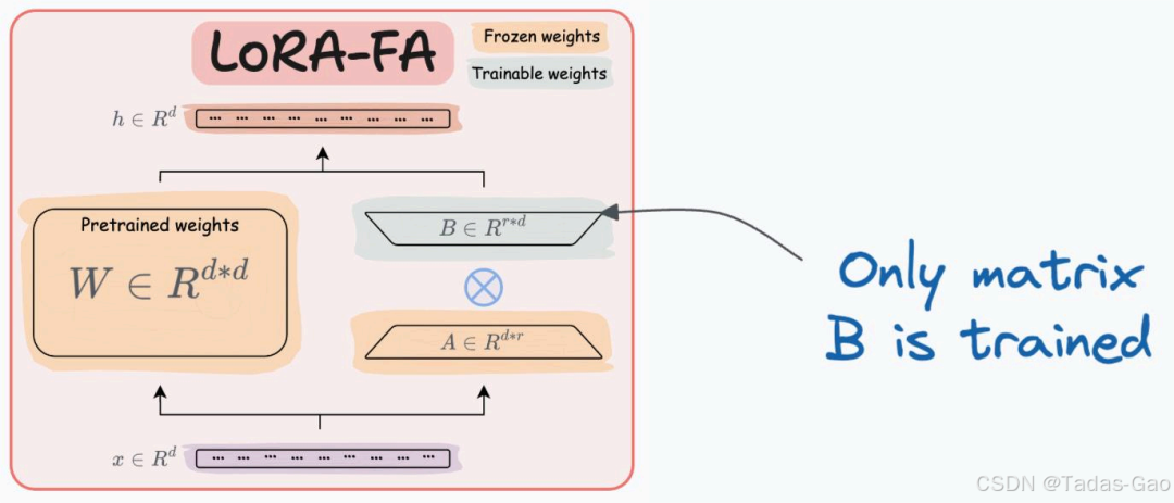 虽然LoRA显著减少了训练参数的总量,但仍需大量激活内存来更新低秩权重。LoRA-FA(FA代表Frozen-A)通过冻结矩阵A并仅更新矩阵B来解决这一问题。