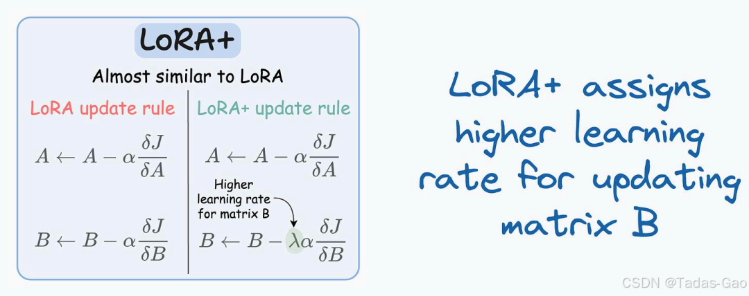 在LoRA中,矩阵A和B均采用相同的学习率进行更新。研究者发现,为矩阵B设置更高的学习率能实现更优的收敛效果,提高训练效率,可加速训练,同时小幅提升准确率。