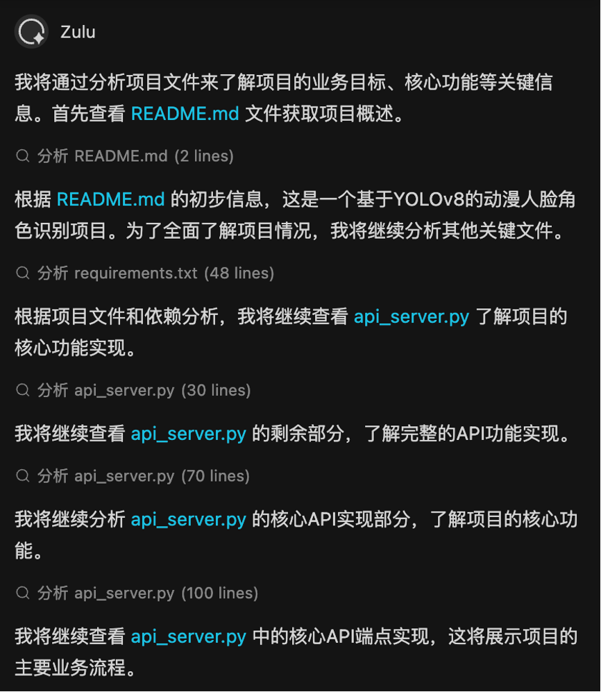 Zulu十分详细地阅读了该代码文件,总结了当前的业务目标、核心功能、整体架构、数据实体、业务流程。这其实也算是一个小小的心得,如果想要使用AI Coding在项目上做二次开发,都需要先让AI通读项目结构内容等,方便做出后面的决策修改。