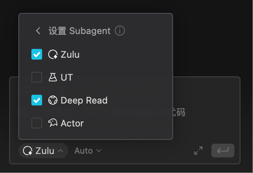 我这里采用的是官方默认Agent模式——Zulu,以及默认的大语言模型设置——Auto,其他功能和智能体还没来得及研究。Zulu是能够满足我当前的开发需求的,并且选择Zulu后点击Subagent配置可以看到,它其实已经内置了DeepRead智能体。