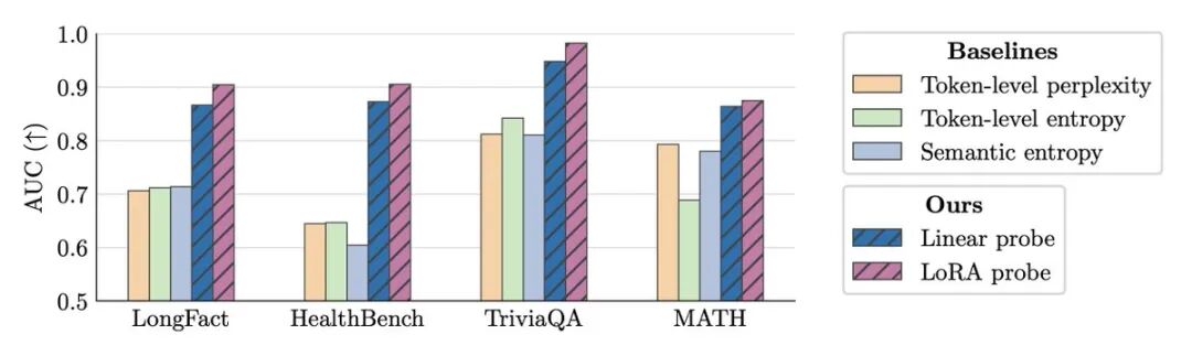 实验结果表明,该方法在多个长文本生成场景中,其AUC远超传统方法,同时,在短问答和数学推理等领域也表现出色。这意味着,即使只针对“实体”进行训练,该检测器也学到了识别更广泛内容真实性的能力。