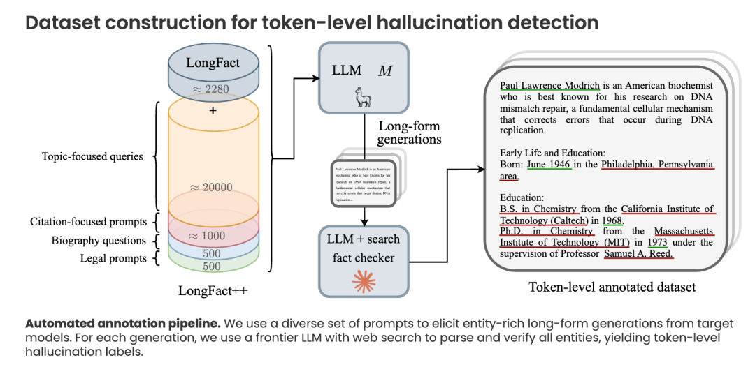 - 自动标注:利用更先进的、带网络搜索功能的模型(如Claude),去自动验证这些回答中的每一个实体,并为每个词(Token)打上“幻觉”或“非幻觉”的标签。