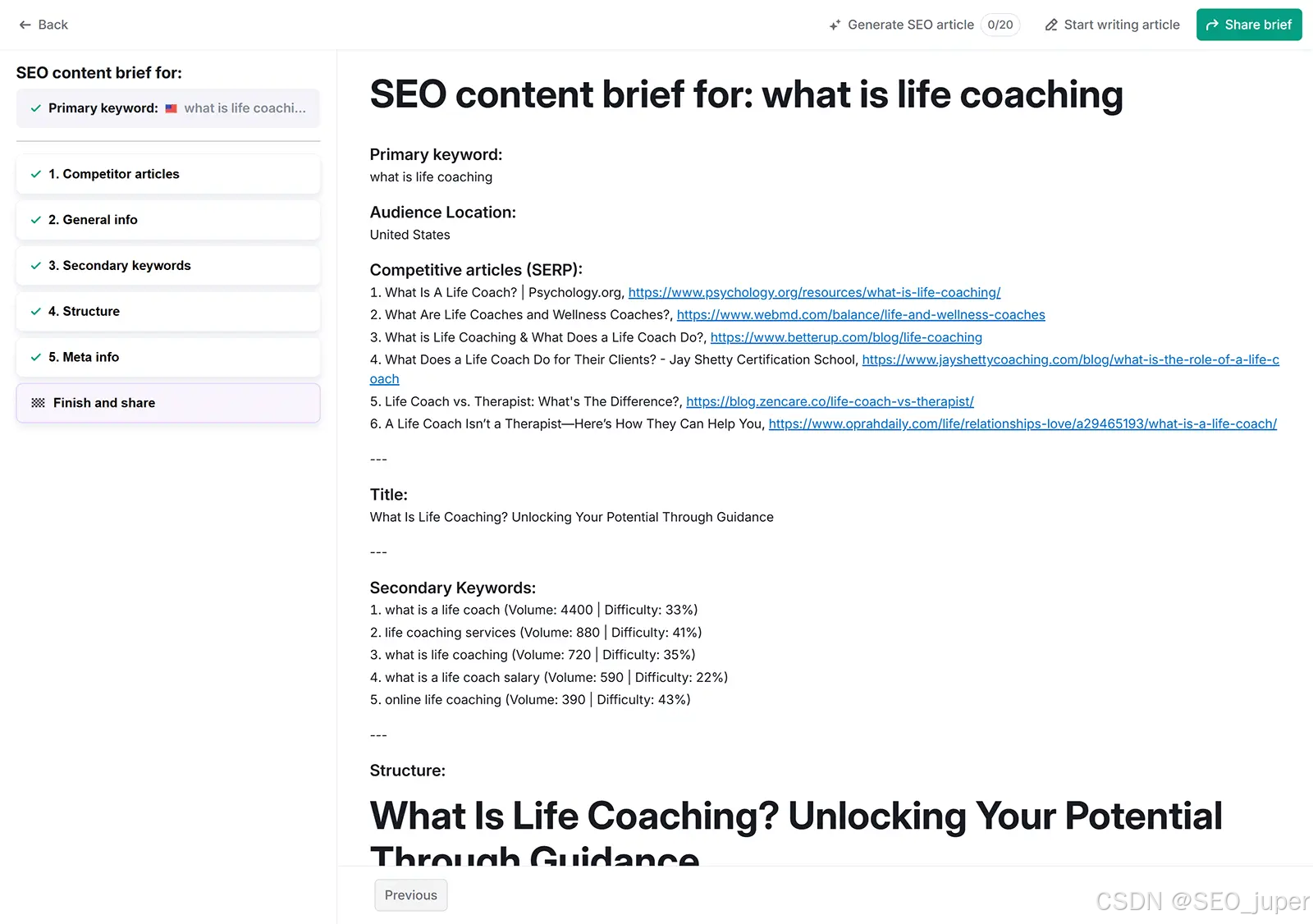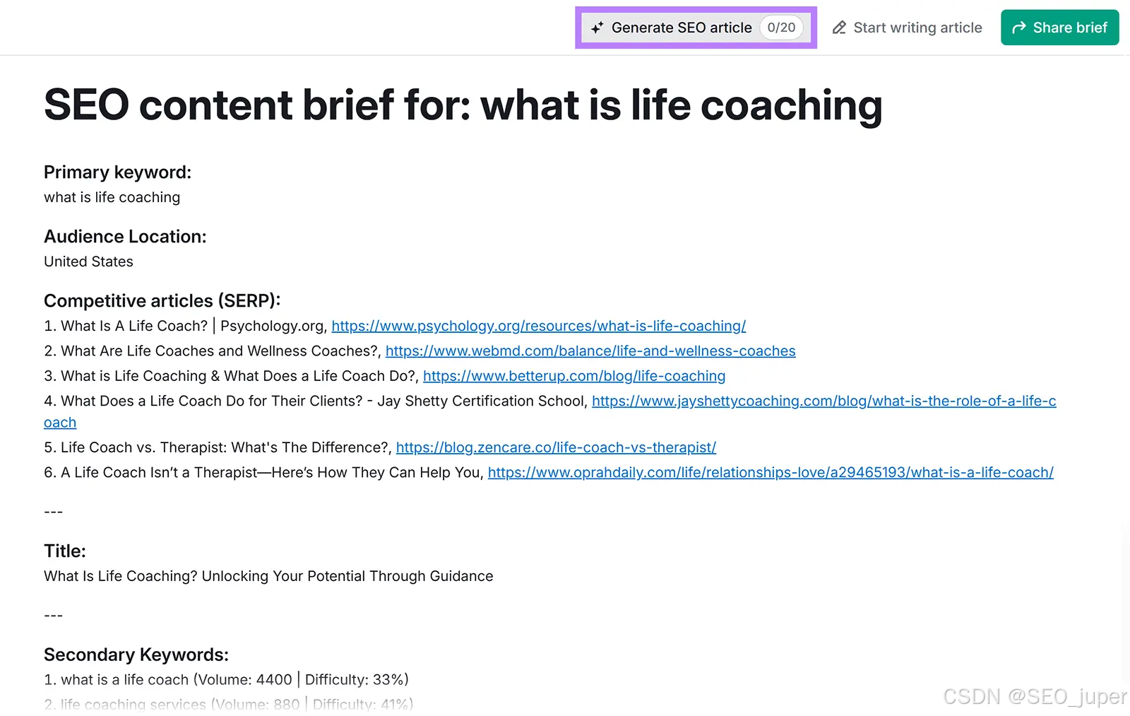 单击您喜欢的标题旁边的“开始写作”>“创建 SEO 内容简介”,以生成可在第三步中使用的 SEO 文章简介。