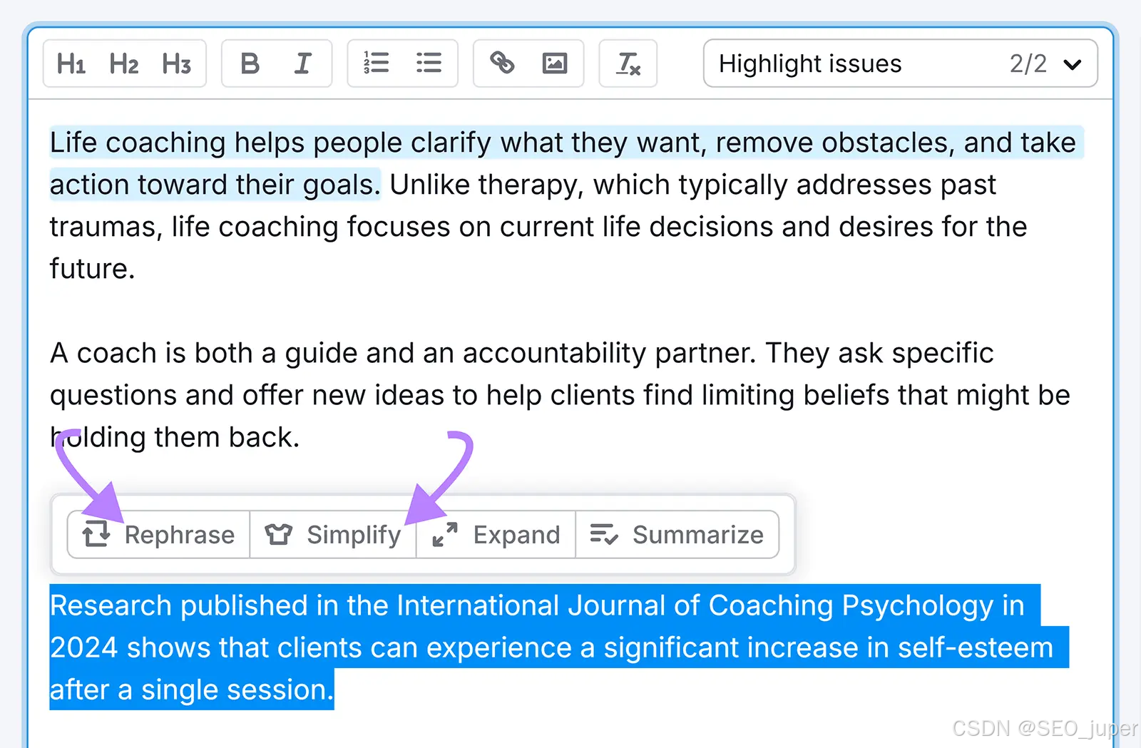 还使用了 Semrush 的 SEO 写作助手工具,并单击“简化”和“改写”按钮来重写一些段落。