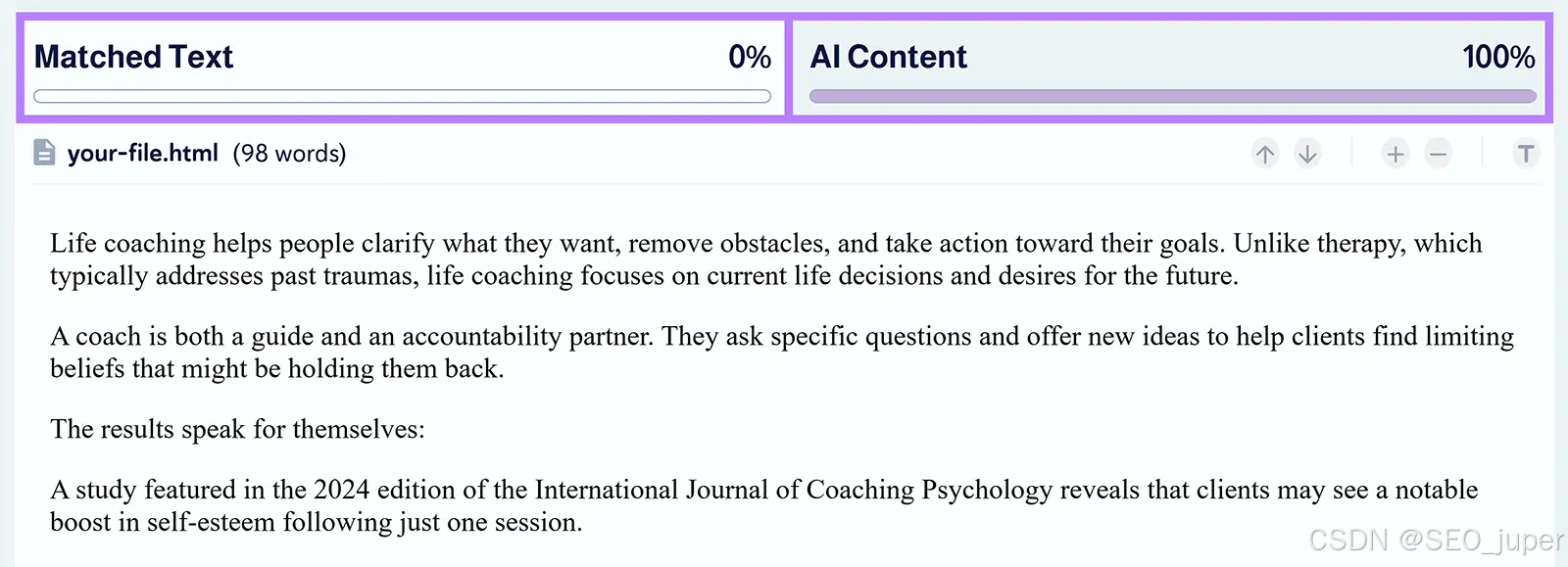 结果?它出现为 100% “匹配文本”和 100% “AI 内容”。这意味着文本几乎可以肯定是用人工智能创建的,并且与网络上其他地方的文本完全匹配或极其接近,而不是原创的。