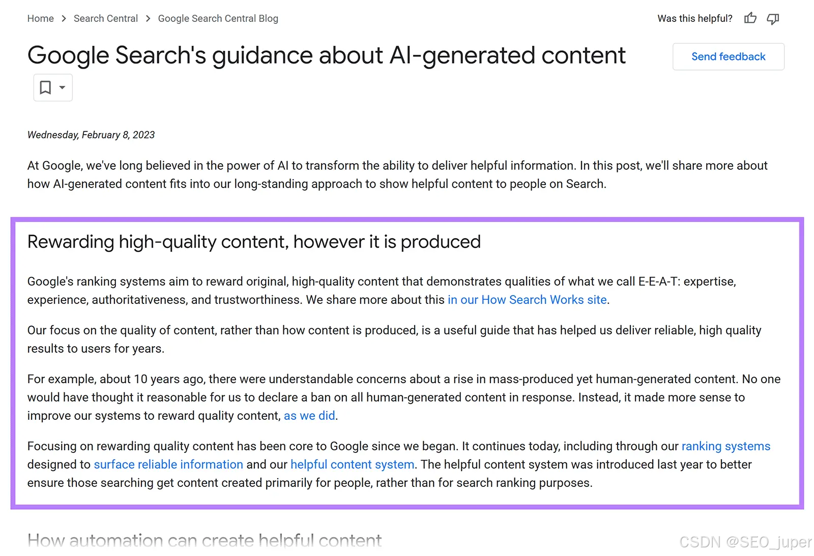 谷歌关于人工智能生成内容的官方指南指出,它不会仅仅因为人工智能编写的内容而惩罚人工智能生成的内容。