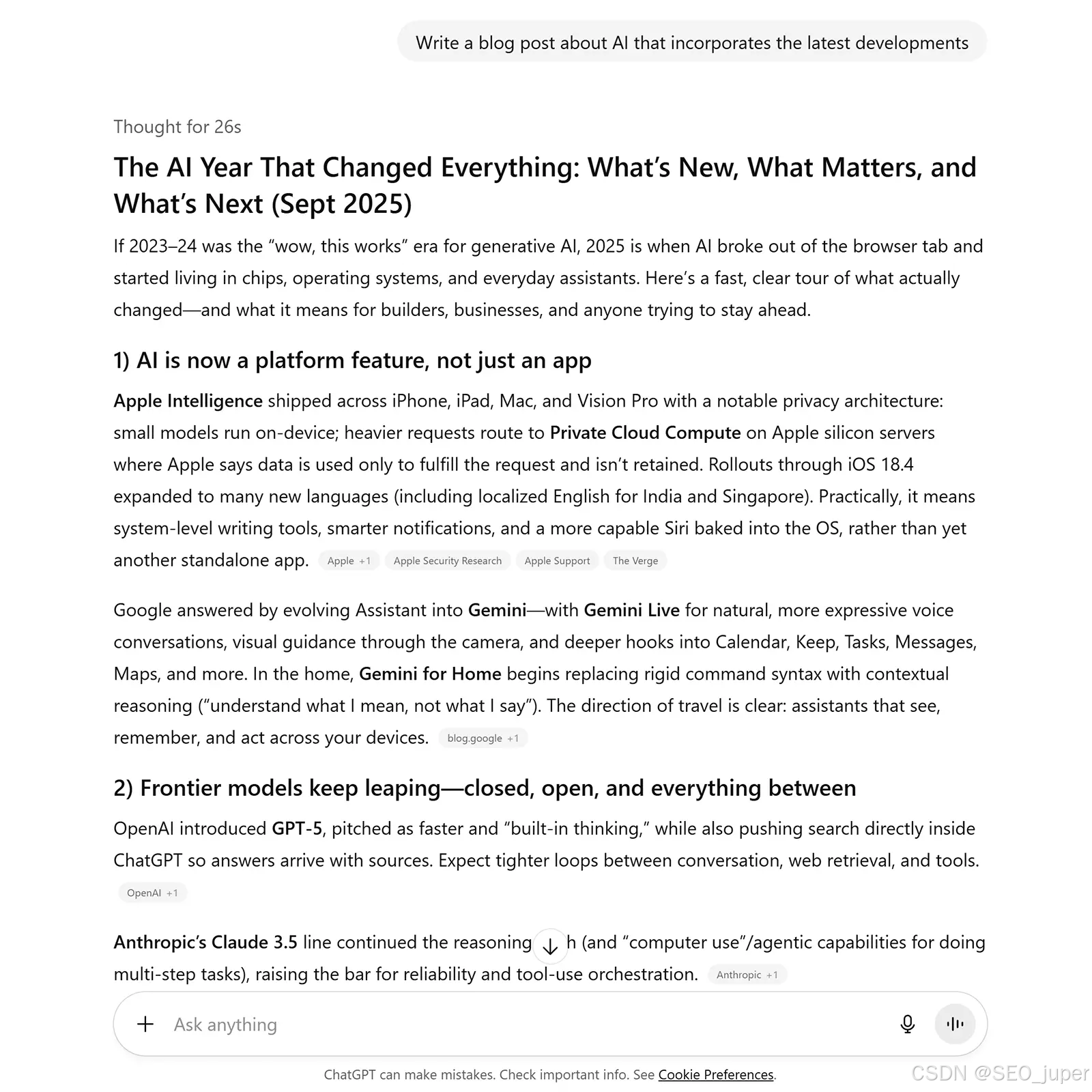 - 用户在 ChatGPT 等聊天机器人中输入提示(例如,“写 SEO 博客文章的介绍”)