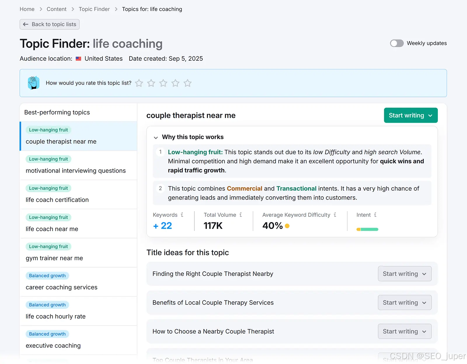 对于每个主题,该工具都会为您提供标题创意、要包含的其他关键字、主题搜索意图的概述(即用户在搜索时试图达到的目标)等等。