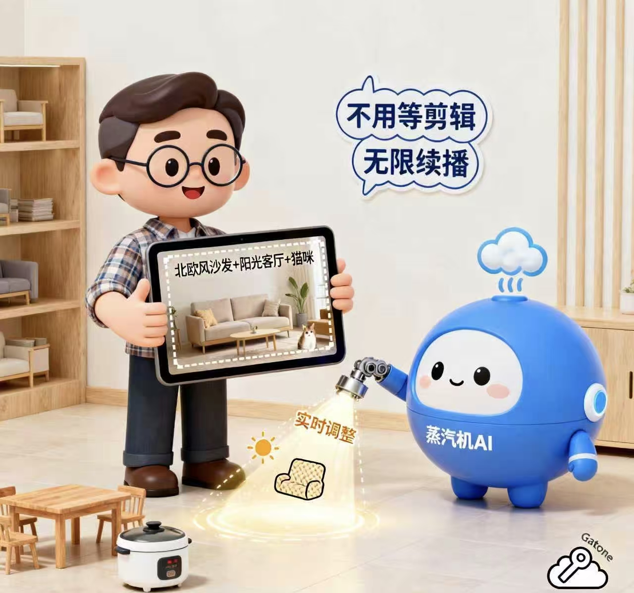 上周帮开家居店的朋友调试百度刚发布的蒸汽机 AI 视频模型,输入 “北欧风沙发摆进阳光客厅,猫咪跳上扶手舔毛”,屏幕上直接开始流式生成画面 —— 不用等完整渲染,前 3 秒画面出现时就能实时调整 “让阳光角度再斜一点”,最终生成的 1 分钟视频连沙发布料纹理、猫毛光泽都清晰可见。朋友翻着手机里以前花 2000 元拍的宣传片,直呼 “这钱以后能省了”。