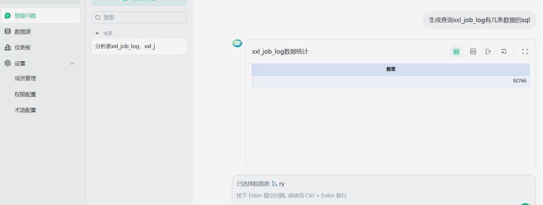 只需配置大模型和数据源即可开启问数之旅,通过大模型和 RAG 的结合来实现高质量的 text2sql。