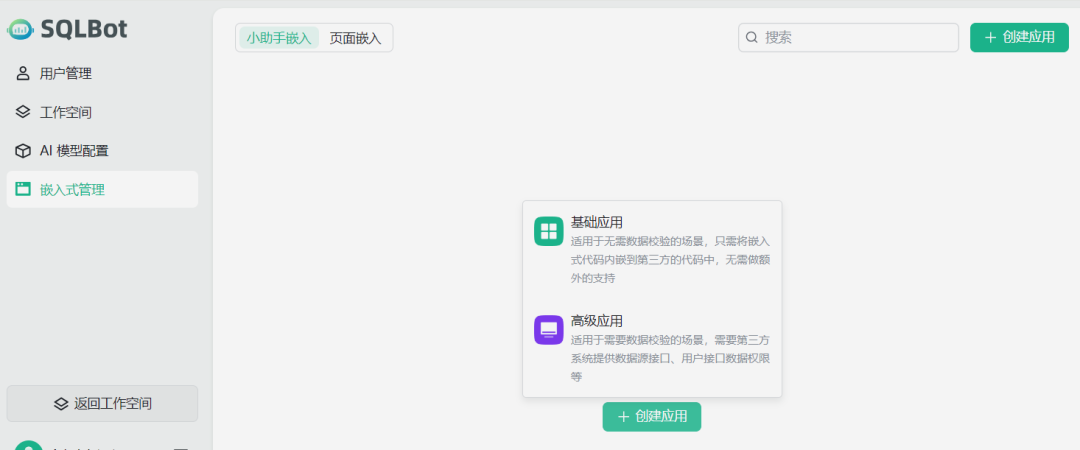 支持小助手嵌入、页面嵌入,其中基础应用适用无需数据校验的场景,只需将嵌入式代码内嵌到第三方的代码中,无需做额外支持。高级应用适用于需要数据校验的场景,需要第三方系统提供数据源接口、用户接口数据权限等。