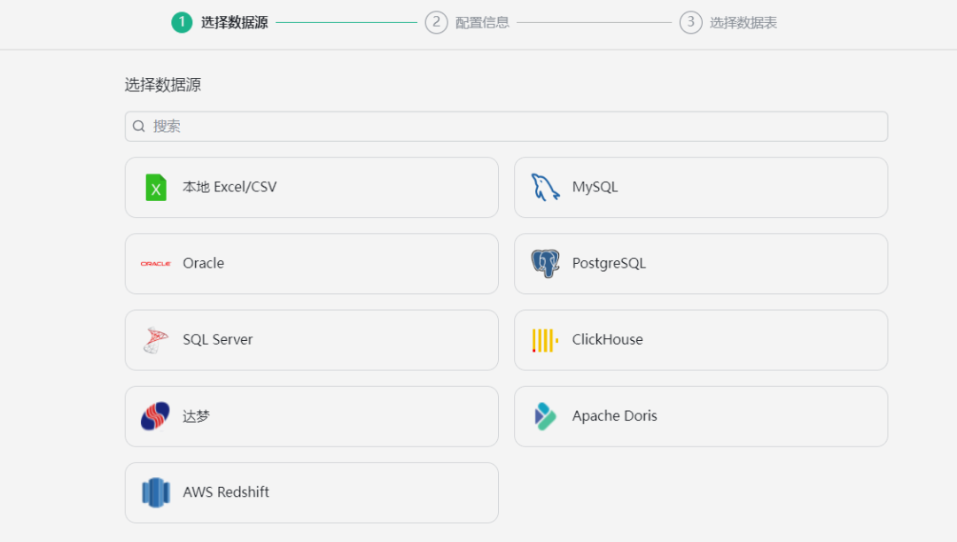 支持添加本地Excel/CSV、Mysql、Oracle、PostgreSQL、SQL Server、ClickHouse、达梦、Apache Doris、AWS Redshift