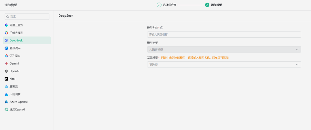 支持添加阿里云百炼、千帆大模型、DeepSeek、腾讯混元、讯飞星火、Gemini、OpenAI、Kimi、腾讯云、火山引擎、Azure OpenAI、通用OpenAI