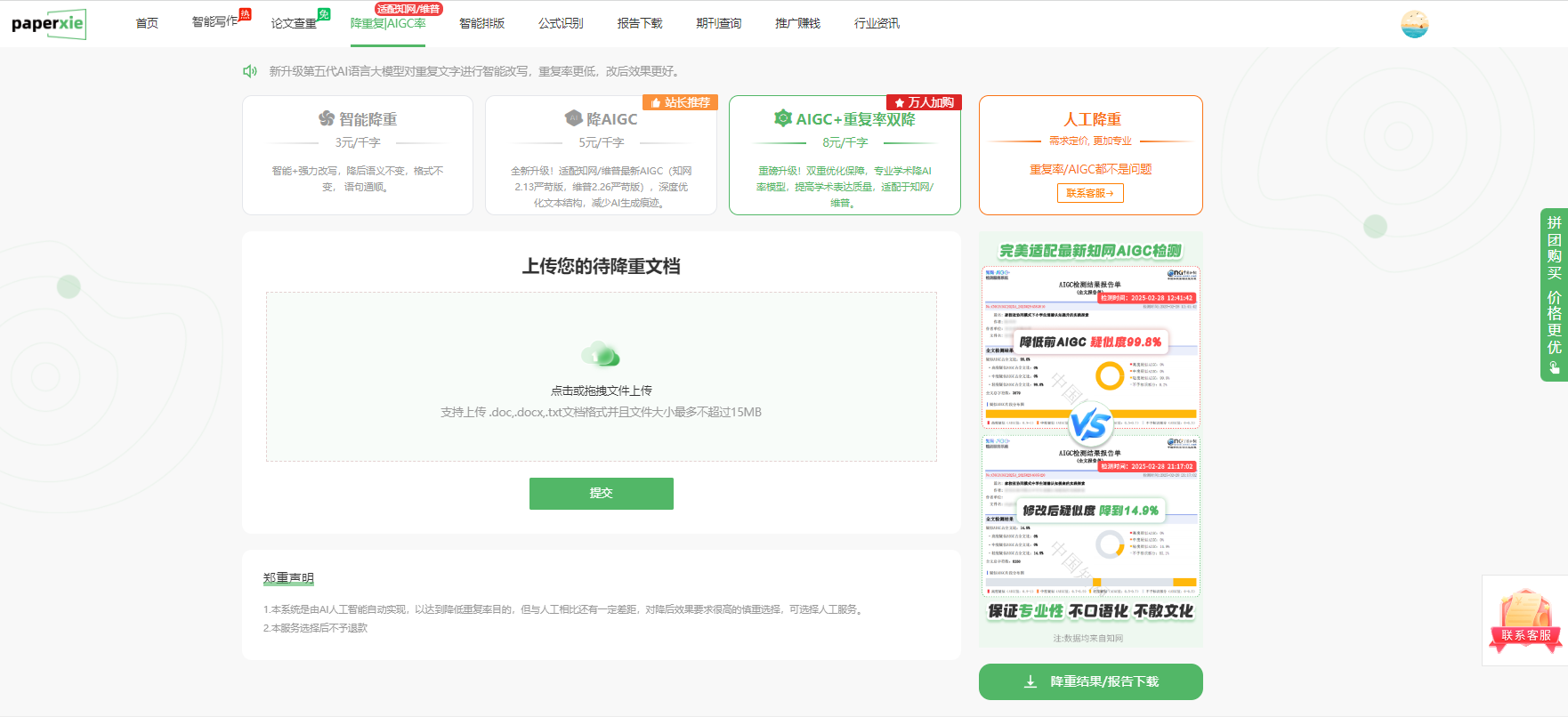 专注于学术方向的降 AI 与降重,在匹配海量文献库后,能在保留核心观点和专业术语的同时,避免内容出现失真、口语化等问题。优化后的文本可顺利通过知网、维普、朱雀等平台的检测,且支持无限重写,七天内对不满意的内容可多次优化。