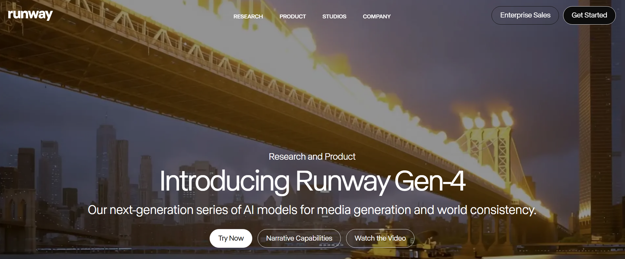 Runway是AI视频生成领域的先驱之一,其推出的Gen-4模型将文生视频(Text-to-Video)和图生视频(Image-to-Video)技术推向了新的高度。它让普通用户仅凭文字描述或一张静态图片,就能创造出电影质感的动态短片。