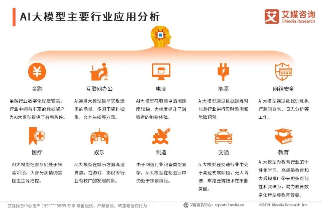 Al大模型已初步具有算力高效利用能力、真实世界感知能力、自主学习能力以及创作能力等。中国大部分的国产Al大模型可在文本、图像等方面赋能,并广泛渗透到娱乐、电商、工作以及垂直领域等各类应用之中,为中国传统行业进行数字化赋能。