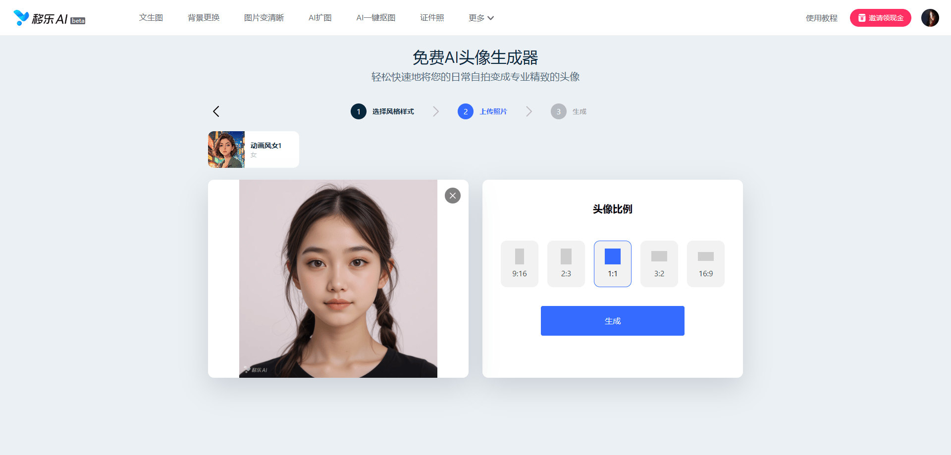 步骤3:点击“上传”,选择电脑中的清晰正脸照。建议背景简洁、光线均匀,避免戴帽子、墨镜等遮挡面部,确保五官清晰可见,表情自然。上传图片同时选择需要生成头像的比例,多种比例可选择,满足多种平台头像大小适配。