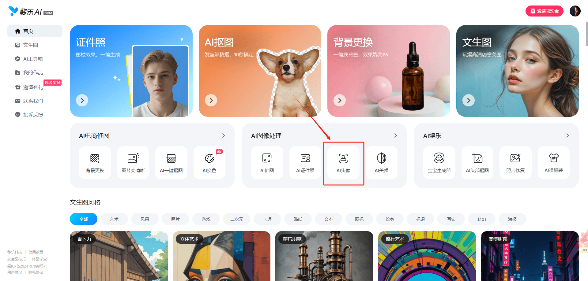 步骤1:网站搜索“移乐AI网站”进入后,选择“AI头像”进入头像工具制作页面;