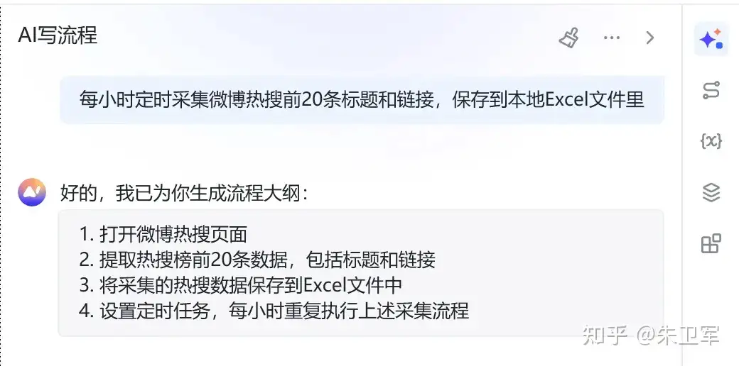 用AI写RPA流程其实就相当于Cursor做代码开发,不需要写代码,甚至不需要拖拉拽就可以实现自动化工作流,是一项非常有突破性的AI应用。