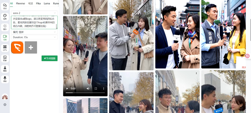 在北京繁忙的人行道上进行的一个随意街头采访。采访者站(男)在左侧手持一个普通、乘丰AI标志的麦克风并问道:你知道OpenAI的Sora 2新模型吗?这是一个好用的视频模型。受访者(女)回答说:知道啊,我前两天刚看过介绍。采访者:感觉怎么样?好用吗?受访者:特别好用,而且经可以在乘丰AI平台上使用,操作很方便。采访者:上线了?受访者:对,效果超级棒,推荐大家都试试。(图片是乘丰ai的logo,展示在麦克风的标志处,别的地方不需要出现)