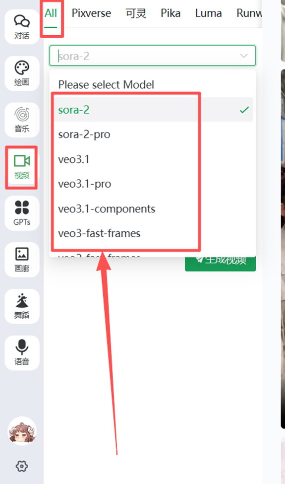 然后点击菜单栏的“AI聊天/绘画”按钮,选择左侧的“视频”功能,加载出的新页面里面选择ALL菜单,然后选择你要使用的模型即可。下图为点击“AI聊天/绘画”菜单后的界面示意图: