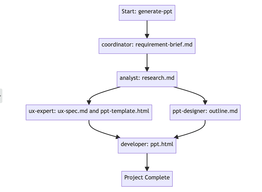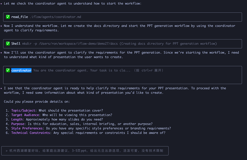 接着阅读 coordinator.md 了解这个 agent 的职责、性格、任务,然后启用这个 agent 到上下文。coordinator 会使用 sub agent 的方式来反问我一些问题,包括 ppt 的主题、阅读观众、长度等。