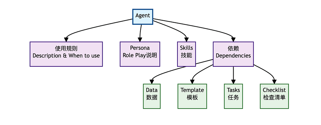 skills模块描述了这个agent能做哪些事情,他由data、tasks、template组织而成。比如create-front-end-spec 这个任务,他的描述是run task create-doc.md with template front-end-spec-tmpl.yaml , 则当需要agent去运行create-front-end-spec任务的时候,AI去加载create-doc.md文件,以及模版文件front-end-spec-tmpl.yaml作格式输出。 完成一个task,还需要一些静态知识,这部分定义在data文件夹。完成后要做一些检查,定义在checklist文件夹。