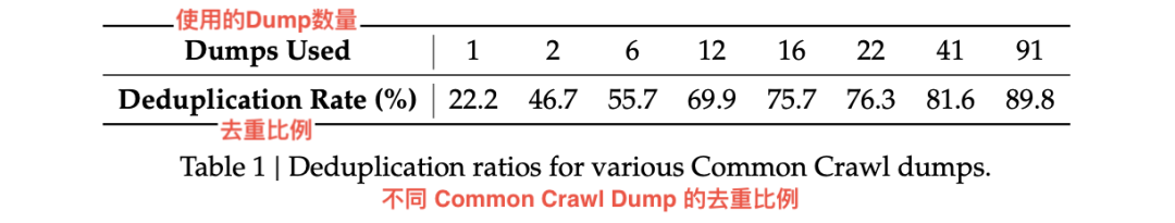 一般模型训练时,只会在单个 Common Crawl dump 内去重(dump:指的是 Common Crawl 的网页快照批次,每月或每季度采集一次;Deduplication Rate”:指在该批次数据中成功删除的重复网页比例)。