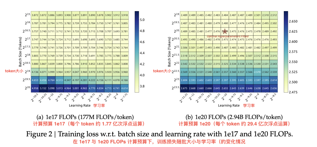 两张热力图表示:在不同计算预算下(左:小规模实验,右:大规模实验),模型的训练效果(损失值)如何随着「批大小 × 学习率」的不同而变化。