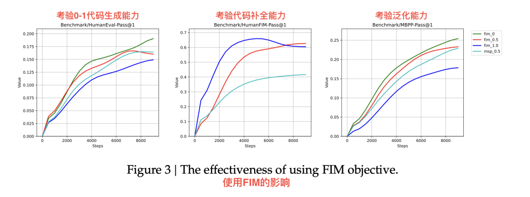 实验结果如图所示:100% FIM 比例的模型虽然在代码补全场景下表现突出,但通用补全能力下降最明显。这说明 FIM 比例存在性能与泛化的权衡:比例越高,模型越擅长“中间补全”;比例越低,模型越平衡“续写”与“补空”两种能力。