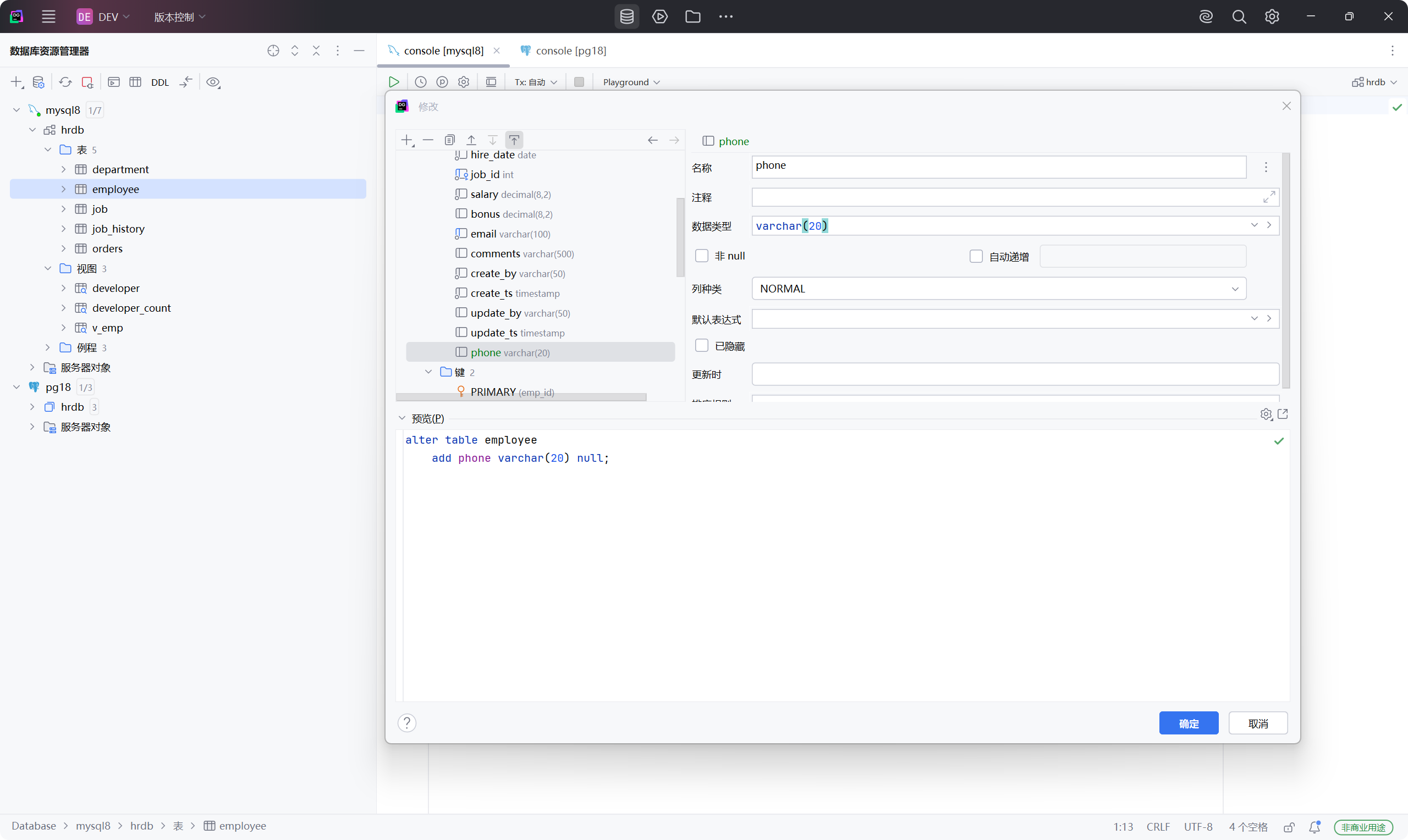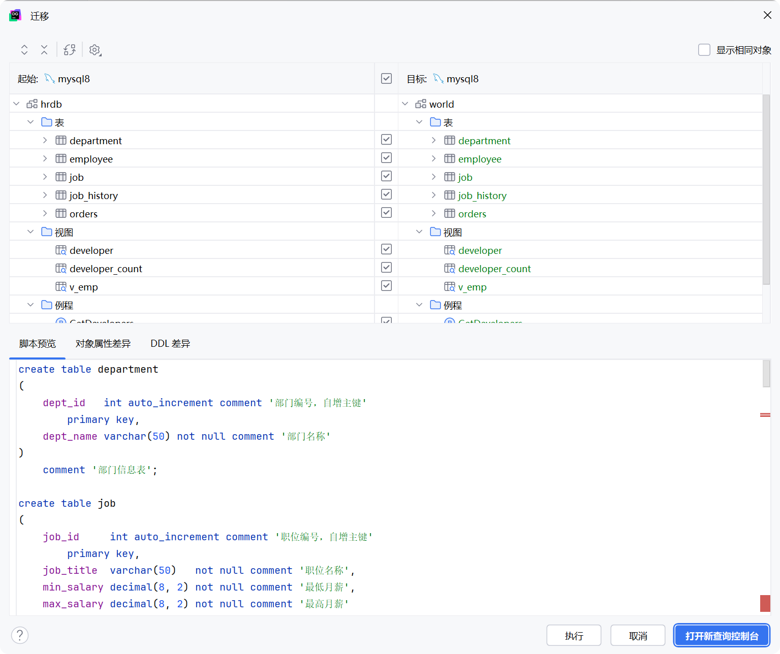 - 模式比较:比较两个模式之间的结构差异,并且为其生成迁移脚本。