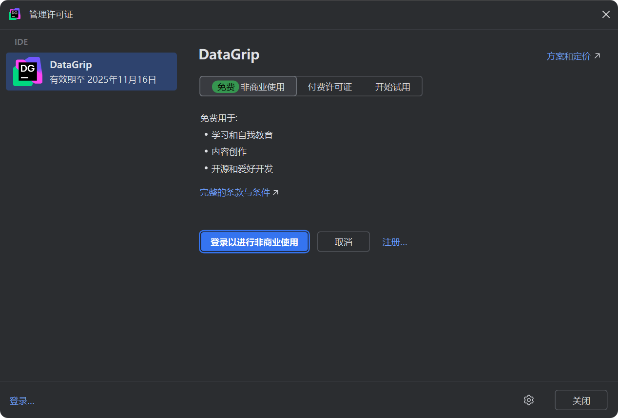 DataGrip 2025.2.4 版本开始,用于非商业用途(例如学习、个人爱好或开源项目开发或者内容创作)可以免费使用该工具。