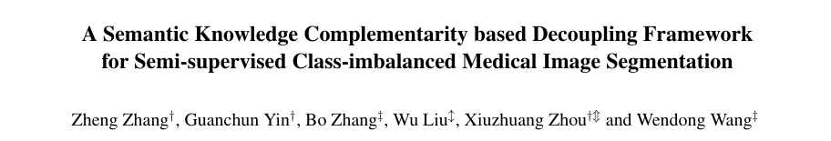 标题: A Semantic Knowledge Complementarity based Decoupling Framework for Semi-supervised Class-imbalanced Medical Image Segmentation (一种基于语义知识互补的解耦框架,用于半监督类别不平衡的医学图像分割)