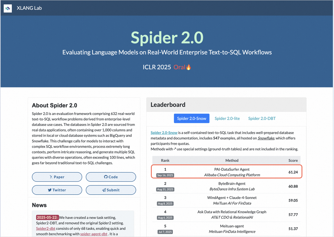 DataWorks Copilot的 NL2SQL 服务在被誉为"最接近真实企业场景"的权威基准测试 Spider 2.0 榜单中位列全球第一。