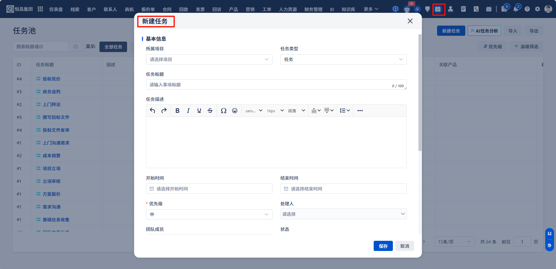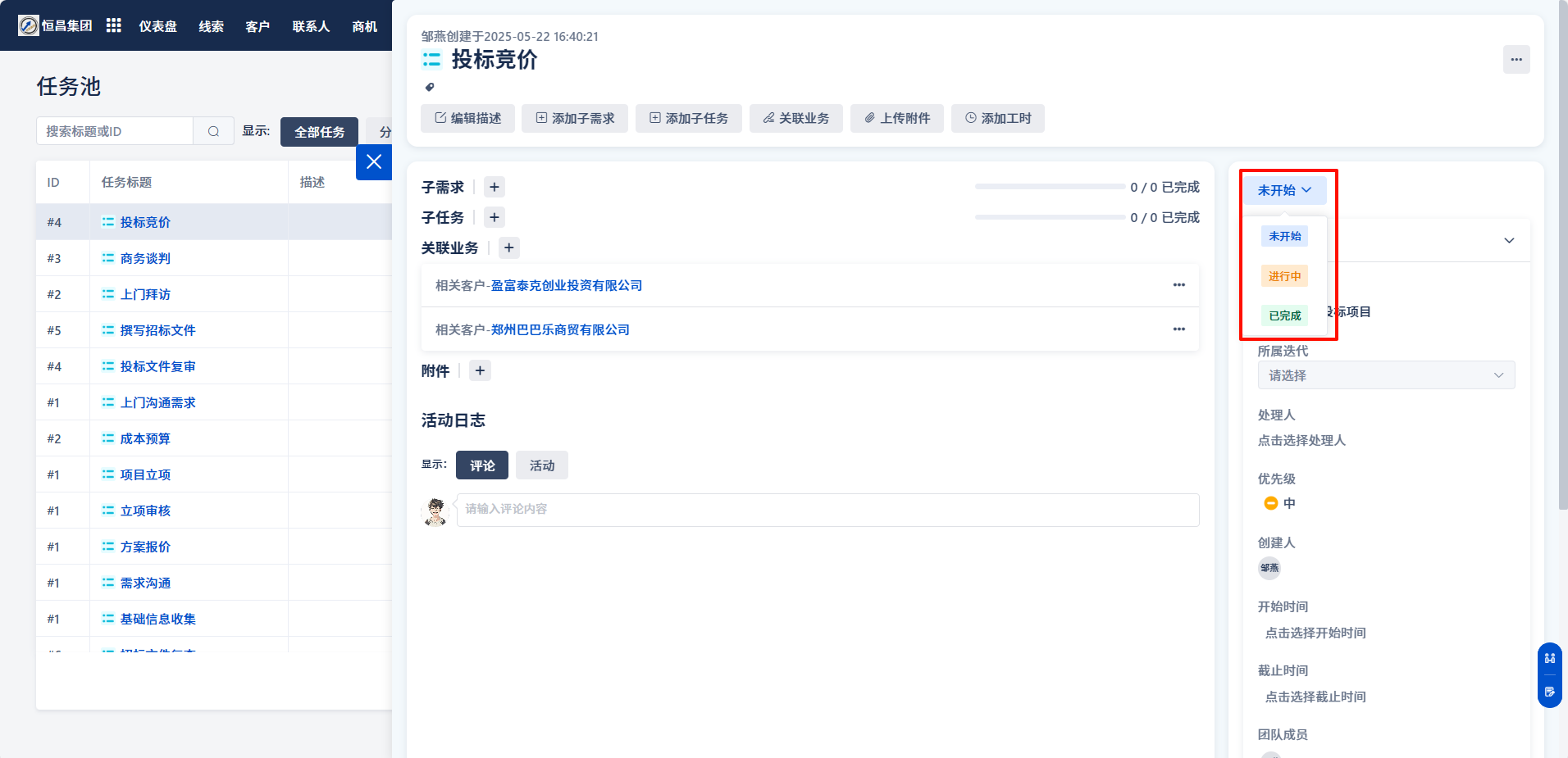 关联对象:可以将任务与客户、商机、合同等其他模块进行关联,确保任务背景信息清晰。