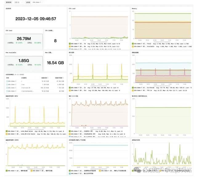 详情监控视图主要包括 CPU、内存、负载、磁盘、文件 IO、网络、进程等相关的监测指标曲线。
