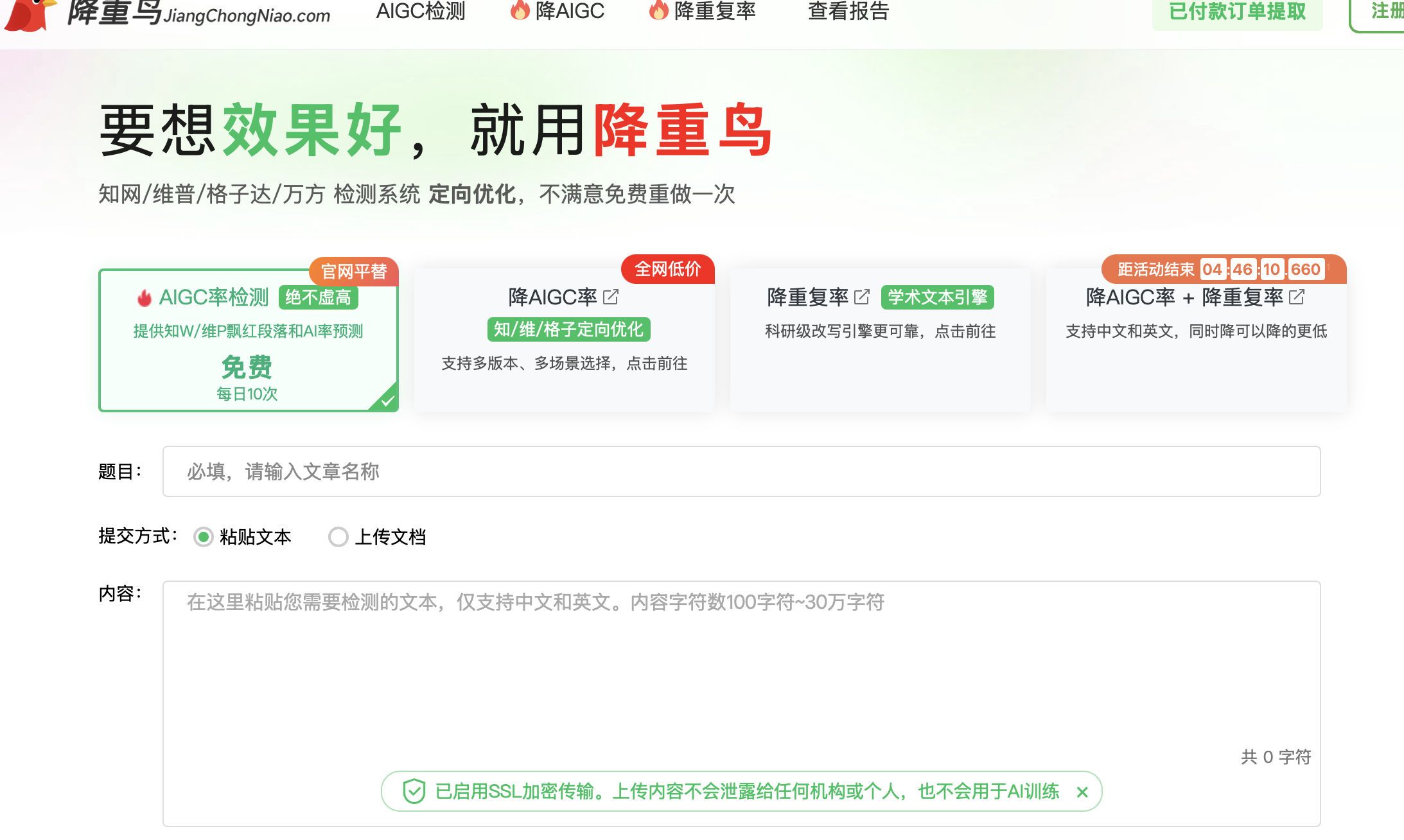 降重鸟是功能齐全的一体化平台, 有查重、降重、AI检测、AI降AI。