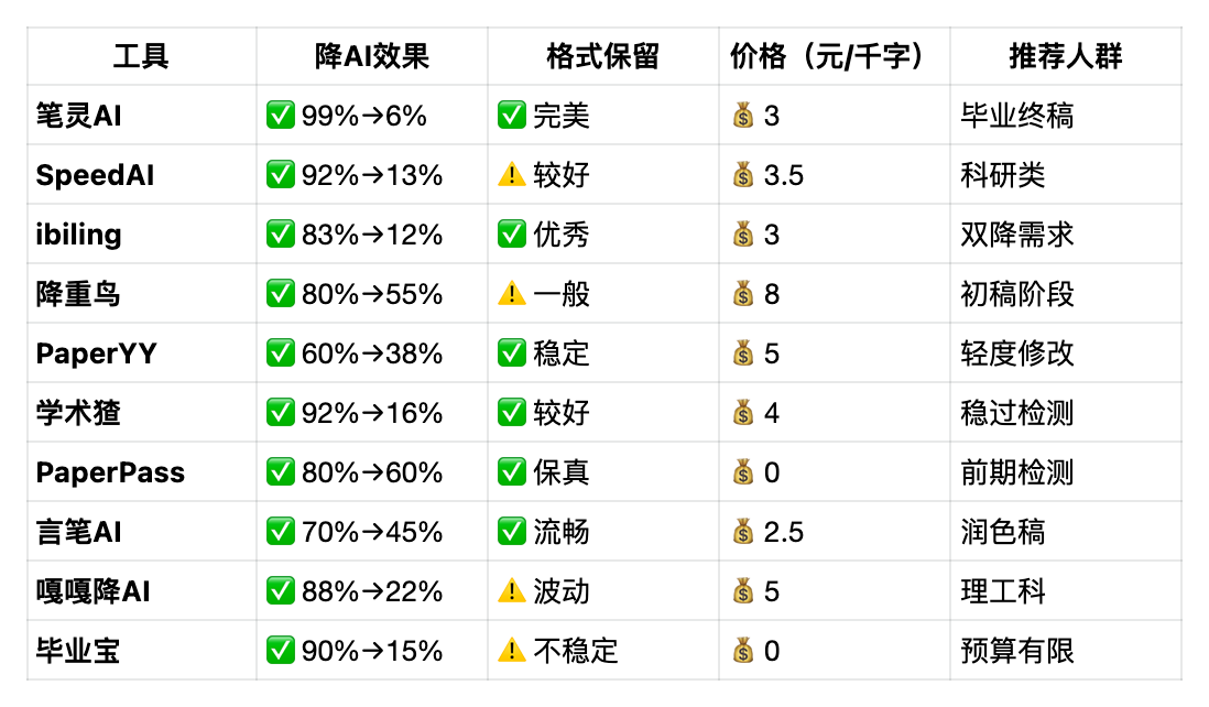 📊 降AI工具对比速览表