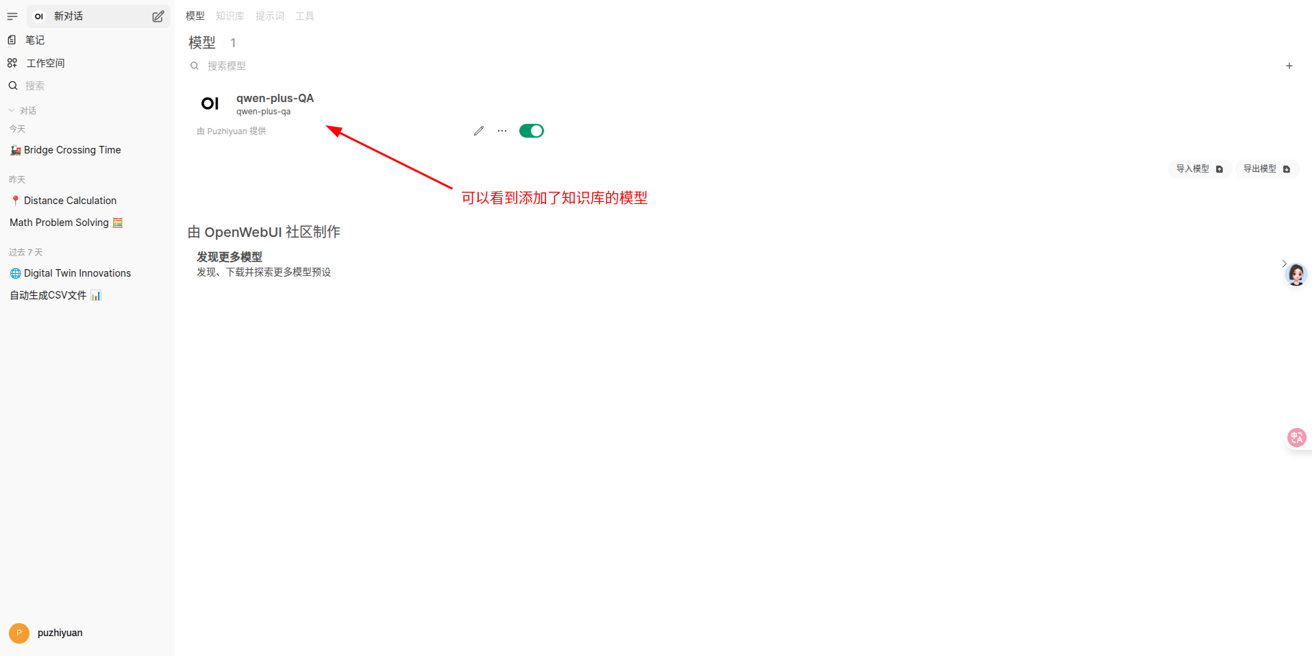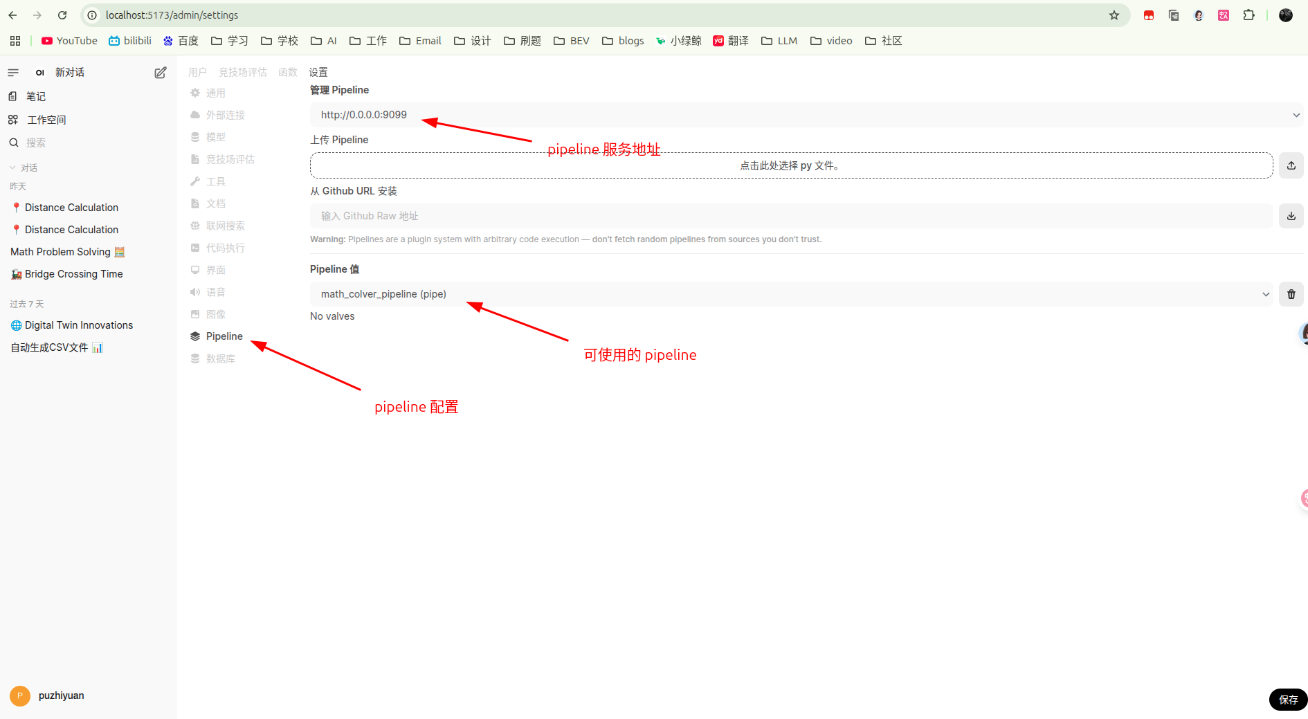 - 在 open-webui 的管理员设置中,选择 pipeline 配置,可以看到上面定义的 pipeline 服务。