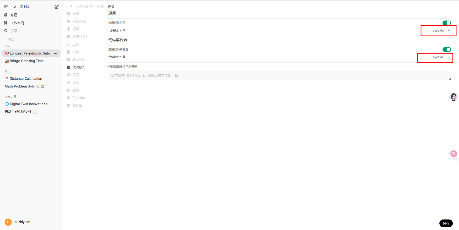 - 使用集成的 Pyodide ,开启代码执行和代码解释,选择 Pyodide。
