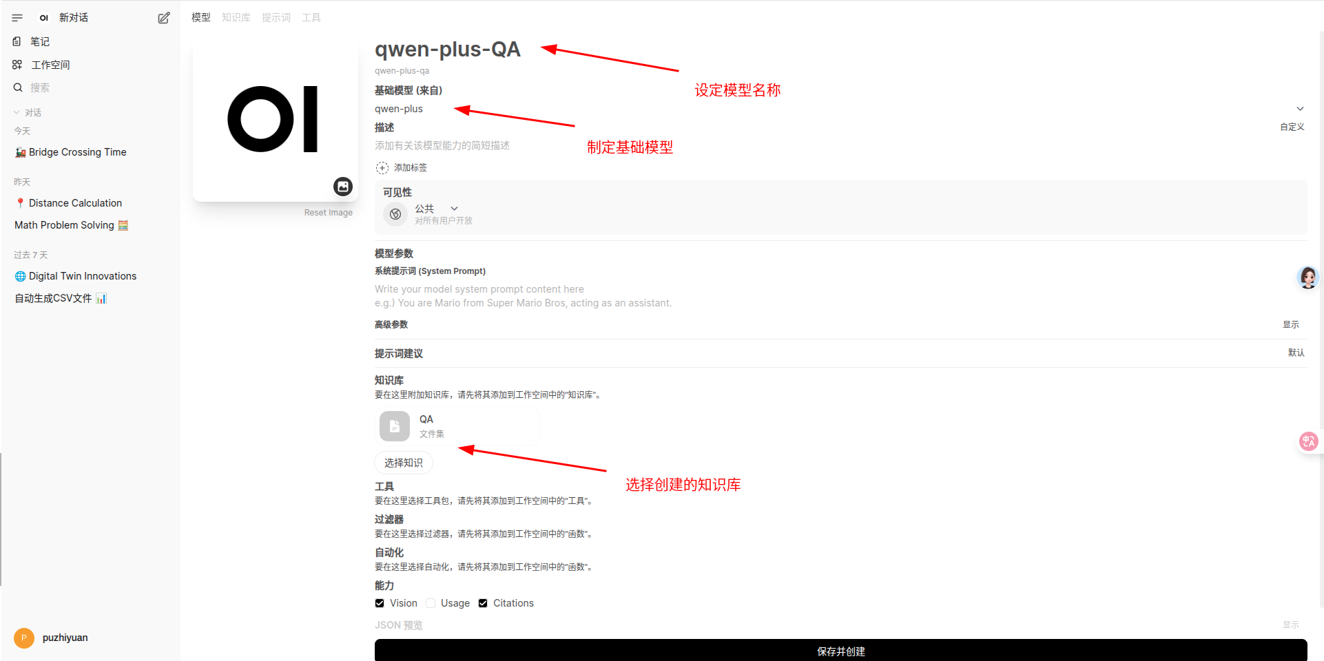 需要指定创建的模型名称、依赖的基础模型和知识库等