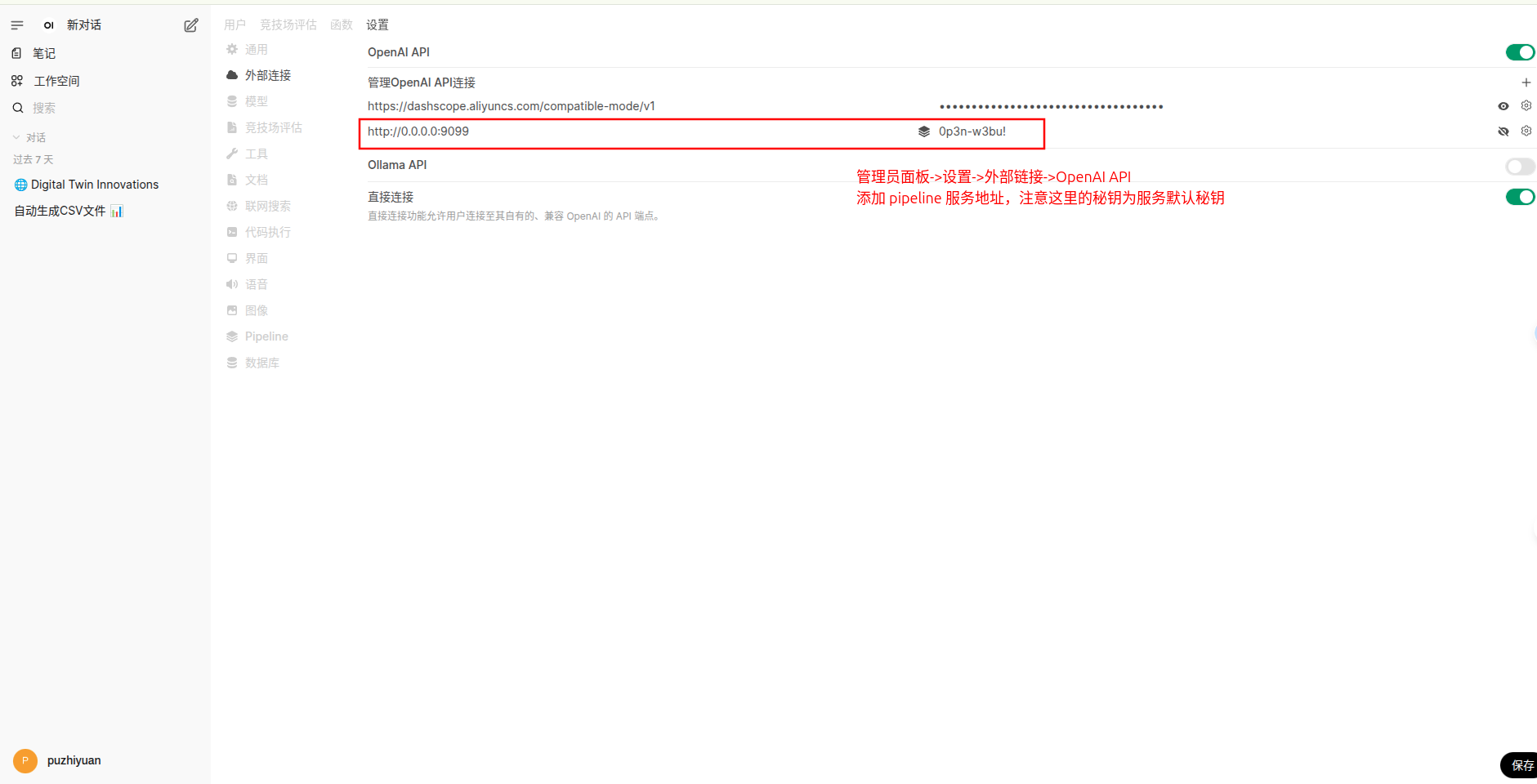 - 配置外部链接,让 open-webui 能够访问到 pipeline 后端。